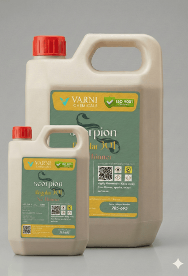 Scorpion Regular 301 Thinner is a high-performance, premium-grade thinner specially formulated for nitrocellulose-based paints, primers, and lacquers. It is designed to deliver excellent flow, quick drying, and a flawless finish, making it the preferred choice for professionals in the automotive, furniture, and industrial sectors.