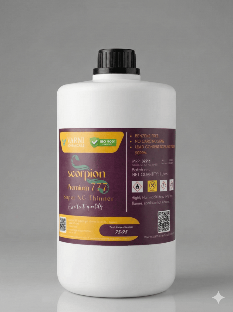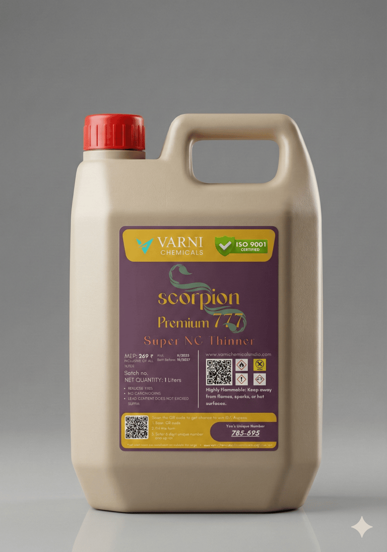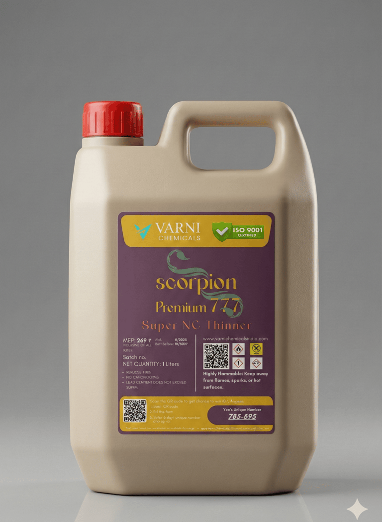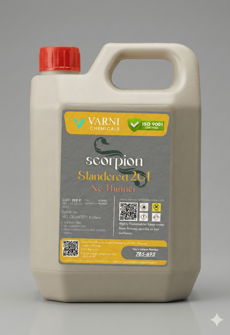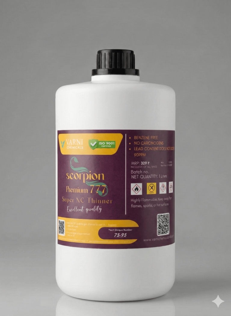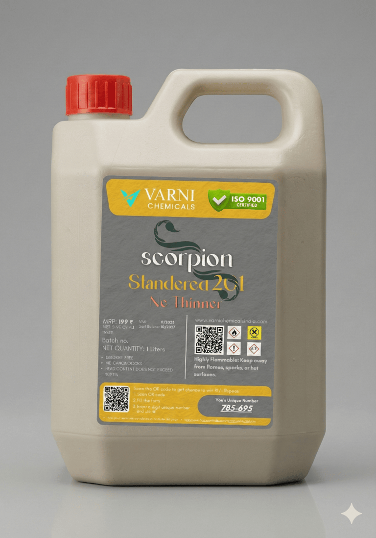Our Scorpion Standered 201 NC Thinner is a high-performance solvent blend specially designed for Nitrocellulose-based coatings. It ensures excellent dilution, smooth application, and a superior finish while maintaining the original properties of the paint or lacquer.